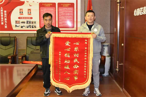 為響應“萬企興萬村”蘭州行動村企結(jié)對興村工作,集團領(lǐng)導深入永登縣兌角村考察調(diào)研,詳細了解該村亟待解決的困難。在了解到該村農(nóng)田灌溉難問題后,捐款3萬元人民幣用于該村農(nóng)業(yè)灌溉井施工項目。12月29日,兌角村黨支部書記、村委會主任趙發(fā)軍一行2人,為泰和集團送來了一面寫有“心系村民辦實事 愛心捐助暖人心”的錦旗,對泰和集團的善舉表示感謝。