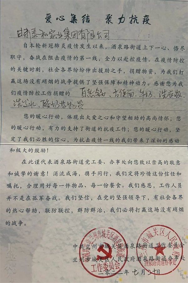 疫情無(wú)情,人間有愛(ài)。7月20日,甘肅泰和實(shí)業(yè)(集團(tuán))有限公司向城關(guān)區(qū)酒泉路街道辦事處捐贈(zèng)牛奶、自熱米飯、方便面、洗衣液、洗發(fā)水、酸奶等生活及防疫物資,全力支持疫情防控工作。